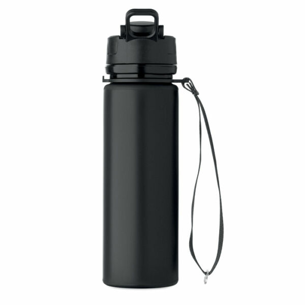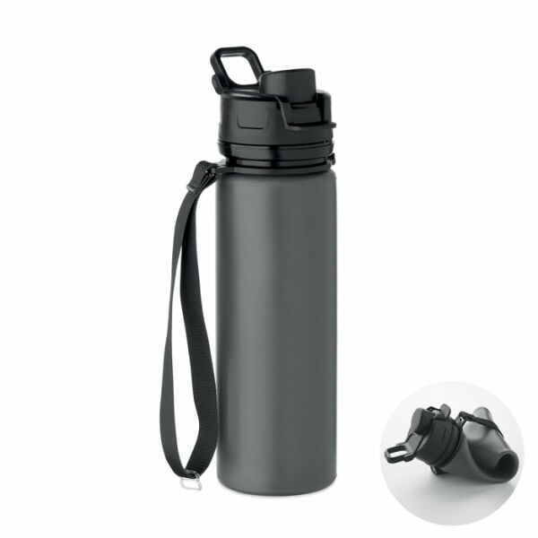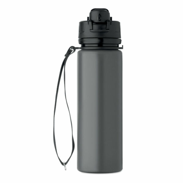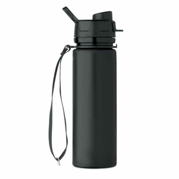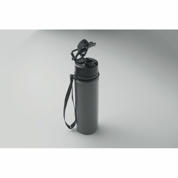 Opvouwbare siliconen sportfles met PP deksel, handvat, polyester riempje en transparante gesp om vast te zetten wanneer opgevouwen. Lekvrij. Inhoud: 500ml.